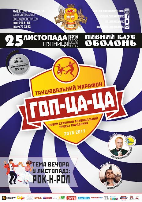 «Колись у Кораблику ми вже робили танцювальні майстер-класи у вигляді розважально-кумедних вечірок. Ми вирішили знову повернути давню фішку і надати їй нове життя із професіоналами своєї сфери – мегатанцюристом Волині Олександром Кашевським і крутим ведучим Славком Мазурком. Щомісяця у «Гоп-Ца-Ца» буде новий стиль танцю, чудові призи від партнерів Кораблика, а в кінці сезону фінал забави з крутезними подарунками! У листопаді ми обрали темою для танців відривний рок-н-рол. Тому запрошуємо гарно провести вечір п’ятниці – з користю та позитивом», – кажуть організатори.