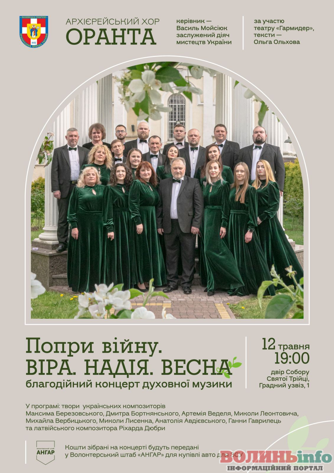 Архієрейський хор “ОРАНТА” та Волинська єпархія Православної Церкви України запрошують на благодійний концерт духовної музики “Попри війну. Віра. Надія. Весна”.