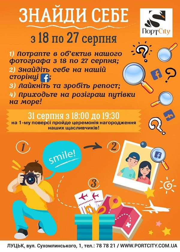 Нагадаємо, що торгово-розважальний центр «ПортCity» оголосив фотоконкурс. «Знайди себе», головний приз – путівка на відпочинок. З 18 серпня у торгово-розважальному центрі «ПортCity» працював фотограф. Щодня світлини з порядковим номерами з’являлися на сторінці ТРЦ у «Фейсбуці». Усі, хто знайде себе на фото повинні поставити «вподобайки» та зробити репост.
