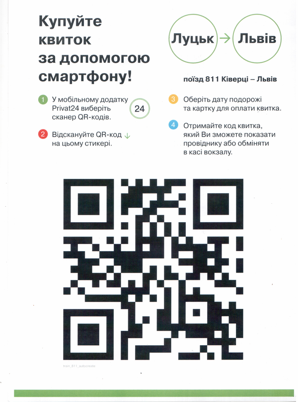 Відтепер через QR-код можна придбати і квитки на потяг 811 “Ківерці-Львів”. Усе, що для цього потрібно, – завантажити на смартфон мобільний додаток Privat24, відсканувати QR-код та підтвердити платіж. Усі процедура займає декілька секунд.