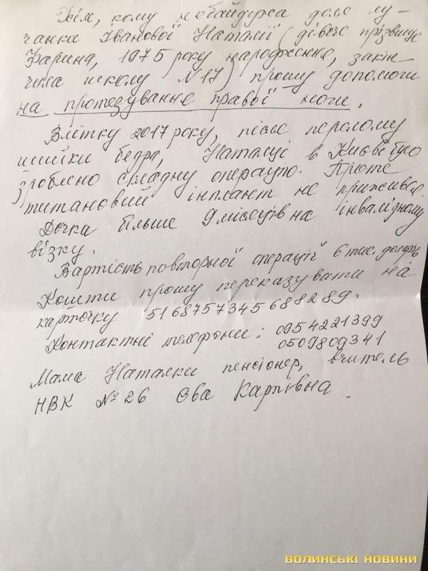 Мама жінки Єва Карпівна розповіла, що влітку минулого року її доньці зробили складну операцію в Києві після перелому шийки бедра, однак титановий імплант не прижився, тому необхідно провести повторну операцію, вартість якої становить 6 тисяч доларів.
