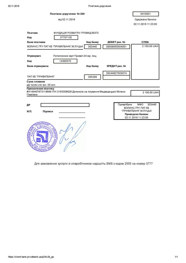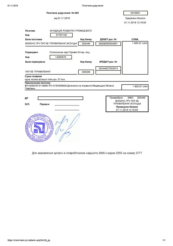 Сьогодні ж в рамках акції перерахували 2100 грн на лікування Медвецької Мілани. Дівчинці лише два роки, однак, у неї діагностовано білліарний цироз печінки. Тож допомогти може лише трансплантація органу у клініці міста Палермо (Італія).