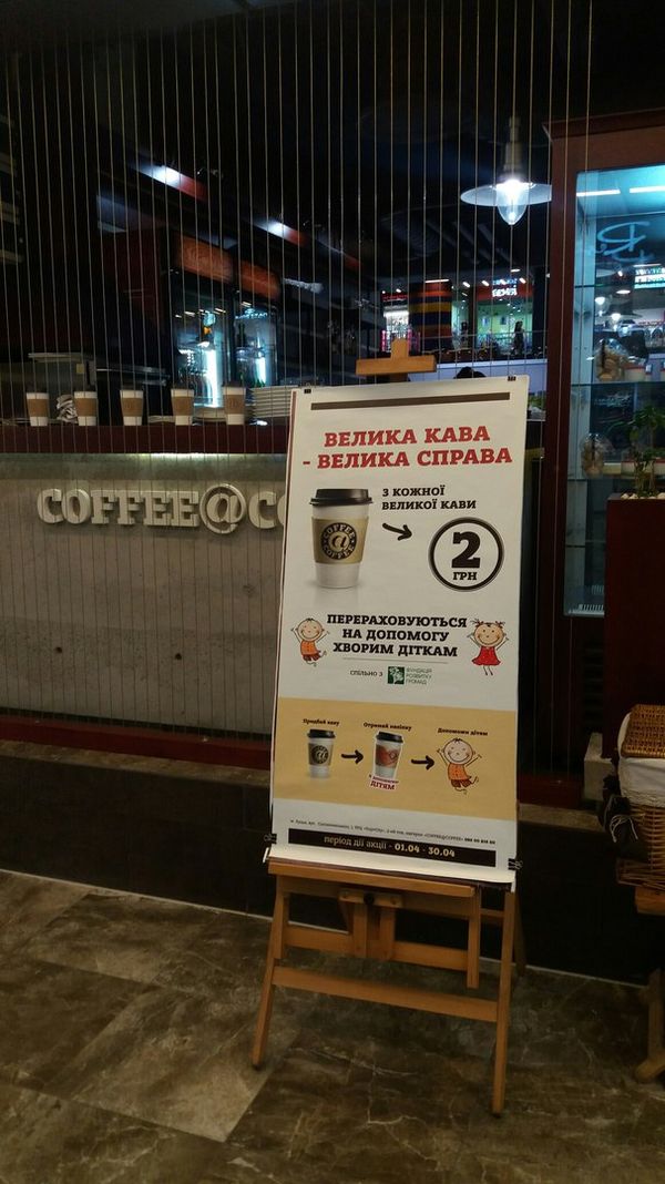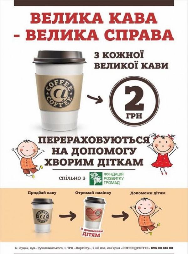 Акцію було запроваджено ще у квітні 2016 року. Її суть полягає у тому, що з кожної реалізованої великої кави передається 2 грн на лікування та придбання необхідних ліків важкохворій малечі. Таким чином уже було надано необхідну допомогу дворічному Базельчуку Любомиру (діагноз: артеріо-венозна мальформація в проекції пінеальної ділянки (аневризма вени Галена?). Вторинна оклюзійна субкомпенсована гідроцефалія) та Надійці Годованюк (діагноз: хронічна ниркова недостатність I-II ступеня).