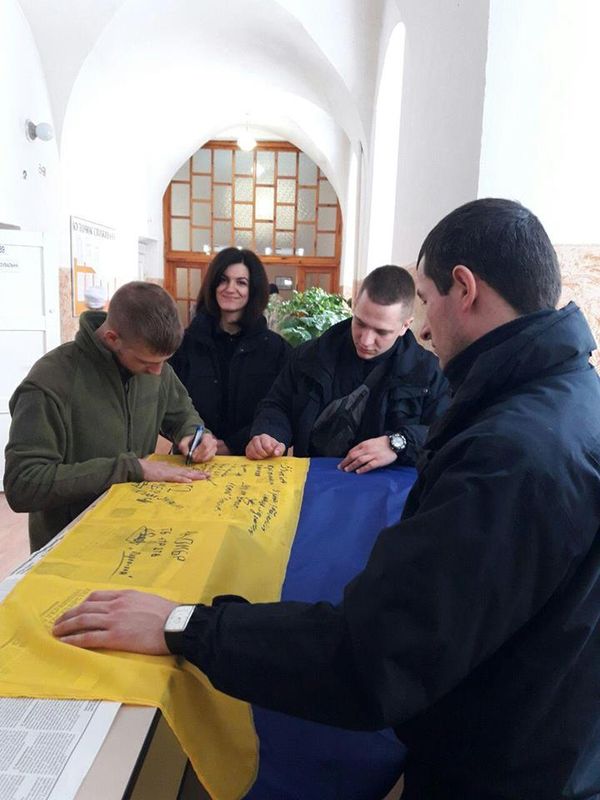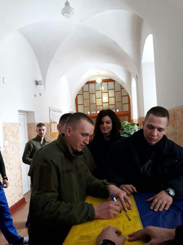 Полісмени принесли з собою подарунки та прапор України, на якому бійці ставили свої підписи і записували місця служби.