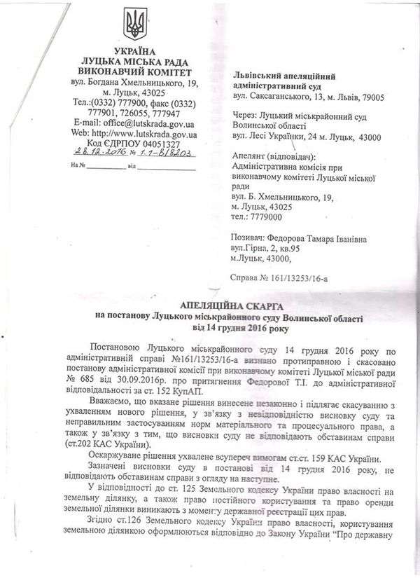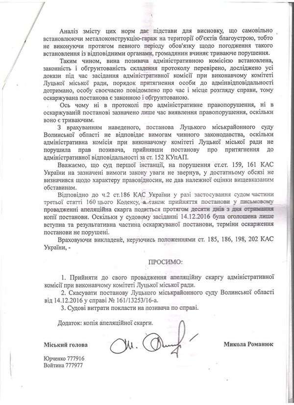 Луцький міський голова Микола Романюк подав апеляцію на рішення Луцького міськрайонного суду, який задовольнив позов власниці гаража на вул. Гірній.