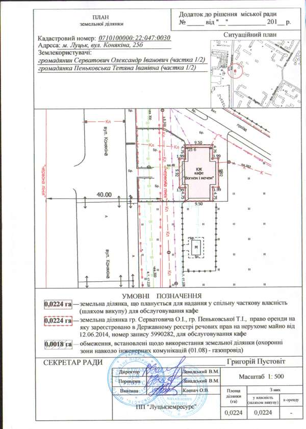 Депутати надали дозвіл на проведення експертної грошової оцінки земельної ділянки несільськогосподарського призначення на вулиці Конякіна, 25б площею 0,0224 га для обслуговування кафе.