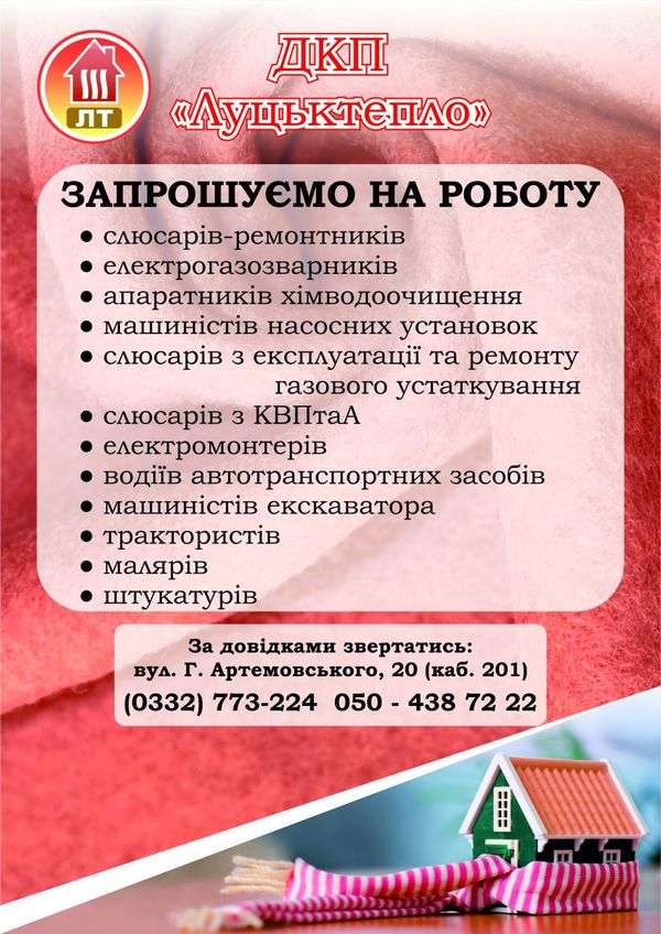 ДКП «Луцьктепло» запрошує на роботу працівників робітничих професій.