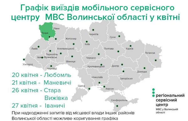 Саме до цих населених пунктів прибуде мобільний сервісний центр МВС, — інформує Регіональний сервісний центр МВС у Волинській області.