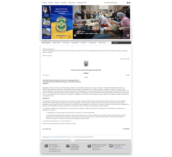 В.о. Міністра охорони здоров’я України Уляна Супрун на своїй сторінці у Facebook повідомила, що це важливий крок для запровадження відкритої та чесної звітності благодійних фондів при закладах охорони здоров’я і чудовий приклад взаємодії з небайдужою громадськістю. Наказ запрацює з січня 2018 року аби всі медзаклади України змогли підготуватися до нововведення.