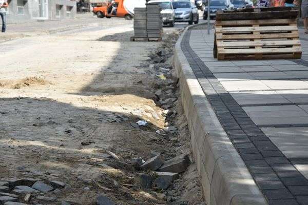 На вулиці Кривий Вал відновлюють тротуари. Знято старе покриття, встановлено бордюрний камінь, влаштовують основу, а на окремих частинах уже викладають нову бруківку.