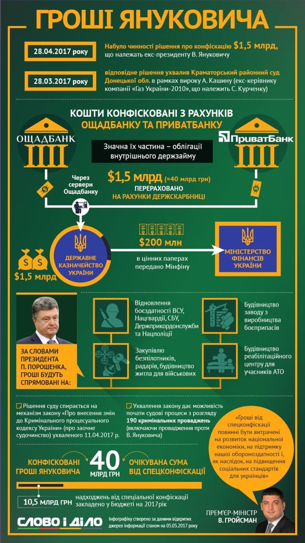 28 квітня набрало чинності рішення Краматорського районного суду Донецької області про конфіскацію півтора мільярдів доларів, що належать колишньому президенту Віктору Януковичу і його оточенню і арештовані на рахунках Ощадбанку і Приватбанку.