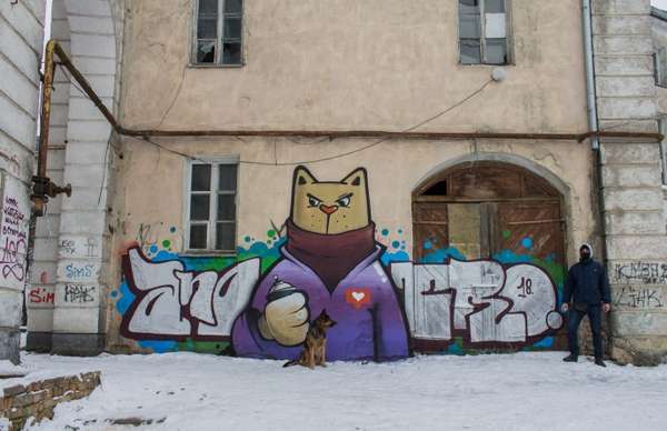 Відомий луцький художник Андрій Присяжнюк виклав у себе на сторінці в Facebook зображення графіті, яке тепер прикрашає стіну колишнього будинку офіцерів, що на вулиці Винниченка. Зображення не видно зі сторони Винниченка, до стіни можна підійти зі сторони вулиці Потапова. Тепер на стіні зображений величезний кіт. Досі тут були різні незрозумілі надписи, – пише “Конкурент”.