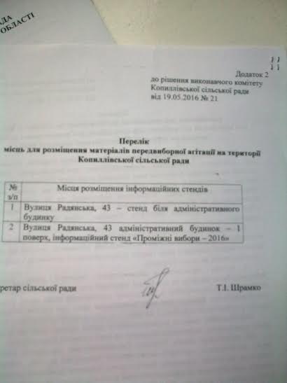 Згідно з рішенням Копиллівської сільської ради від 19 травня 2016 р. № 21 для розміщення агітації в населеному пункті відведено стенд біля адміністративного будинку на вул. Радянській та інформаційний стенд «Проміжні вибори – 2016», що знаходиться у адміністративному будинку на першому поверсі. Використання інших місць для розміщення друкованої агітаційної продукції не передбачено.