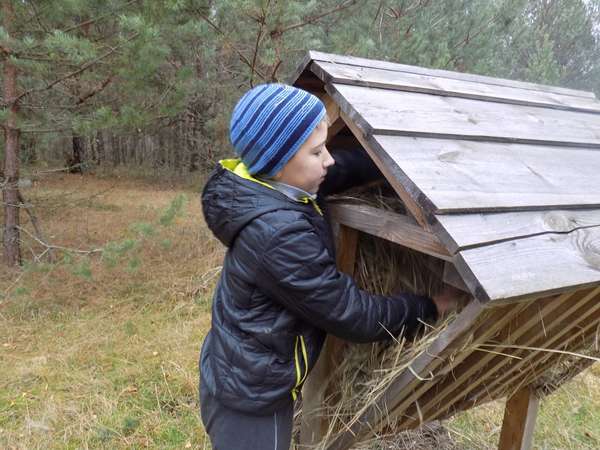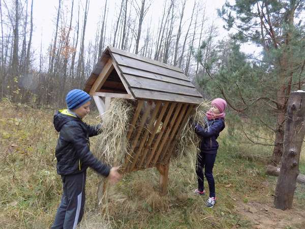 Другою зупинкою для дітей став підгодівельний майданчик для козуль та лосів. Саме тут діти і закопали свій «подарунок» та насипали туди солі, поклали сіно у годівниці.