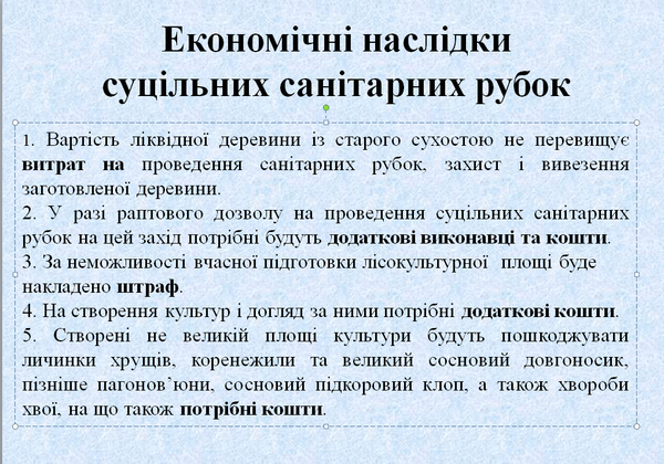 «Хочу також наголосити, що вартість ліквідної деревини із старого сухостою не перевищує витрат на проведення санітарних рубок, захист і вивезення заготовленої деревини. А для проведення додаткових суцільних санітарних рубок потрібні будуть додаткові виконавці та кошти. За неможливості вчасної підготовки лісокультурної площі на лісівників буде накладено штраф. На створення культур і догляд за ними також потрібні додаткові кошти», – зазначила науковець, наголосивши, що вчора мала нагоду оглянути, як ростуть культури на Волині і переконалася, що майбутні ліси нині в досить гарному стані.