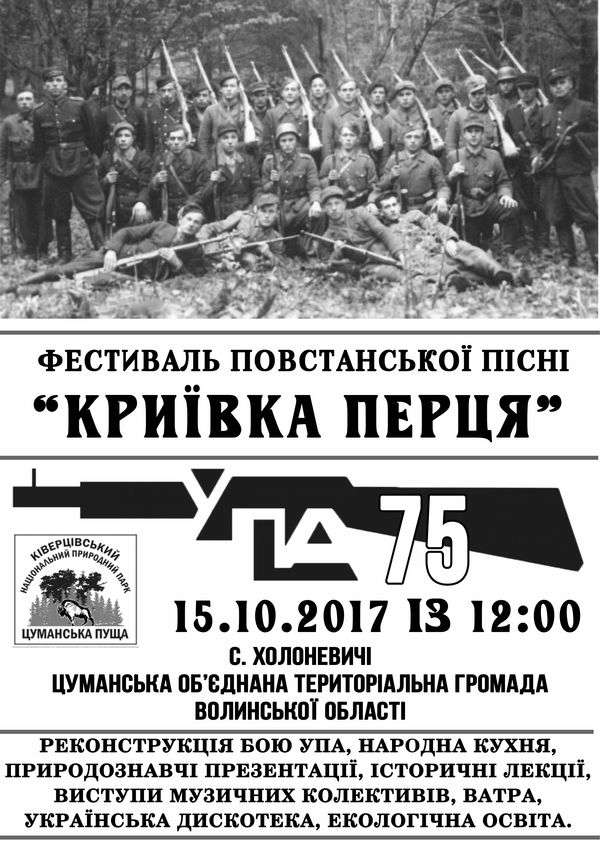 Ківерцівський національний природний парк «Цуманська пуща» запрошує відвідати другий фестиваль повстанської пісні «Криївка Перця», який відбудеться 15 жовтня 2017 р. в с. Холоневичі, що входить до нової майбутньої Цуманської об’єднаної територіальної громади, Волинської області. Фестиваль присвячений 75-річчю створення Української повстанської армії. Вхід безкоштовний.