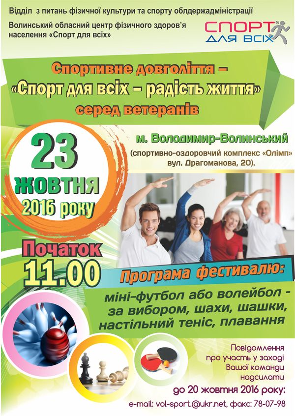 23 жовтня 2016 року в м. Володимир-Волинський (спортивно-оздоровчий комплекс «Олімп» вул. Драгоманова, 20) об 11.00 год. відбудеться обласний фестиваль «Спортивне довголіття – «Спорт для всіх – радість життя» серед ветеранів.