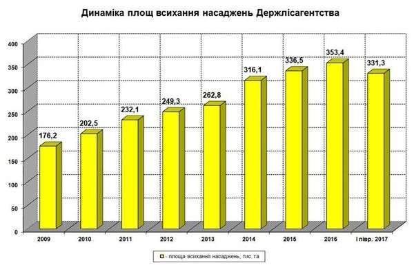 За перше півріччя 2017 року площа всихання насаджень у лісах, підпорядкованих Державному агентству лісових ресурсів, становить 331,3 тис. га.