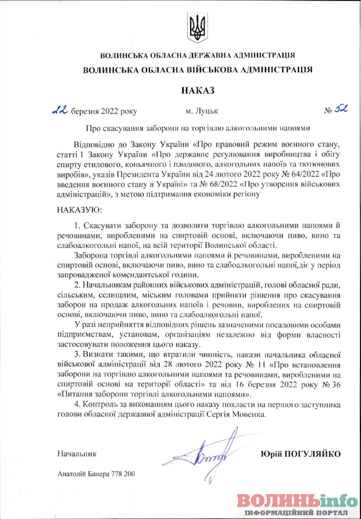 Нагадаємо, з початку війни в Україні діє”сухий закон”, тобто заборона на реалізацію алкогольних напоїв та пива, вина і т.д. Та як повідомляє Волинська адміністрація , у звязку з економічним становищем , заборона на території області скасовується.