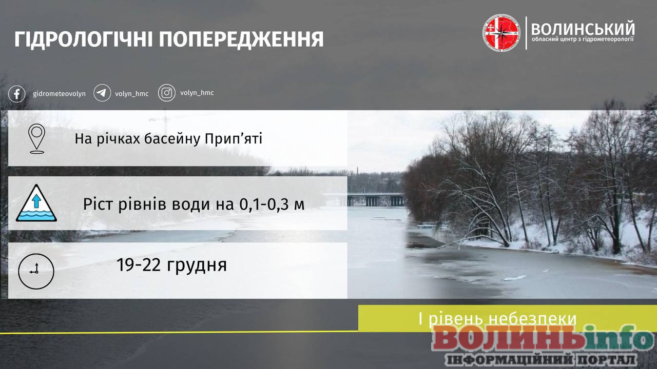 19-22 грудня на річках басейну Прип’яті продовжиться ріст рівнів води на 0.1-0.3 м над рівнями 18 грудня на 08 год. Вихід та подальше затоплення заплав,