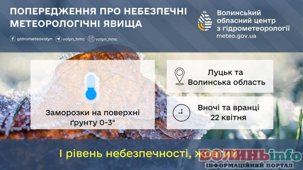 Згідно з прогнозами метеорологів, вночі та вранці у понеділок, 22 квітня очікується значний спад температури повітря, що може призвести до заморозків на поверхні ґрунту. Температура спускатиметься в межах від 0 до 2° в місті Луцьку та від 0 до 3° по всій області.