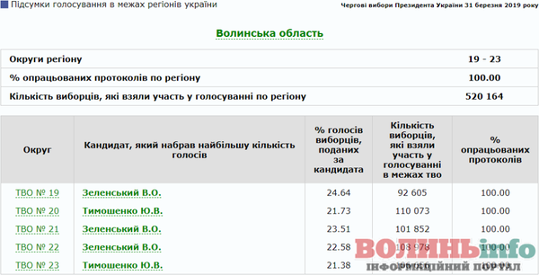 ЦВК опрацювала 100% виборчих бюлетенів по Волинській області.