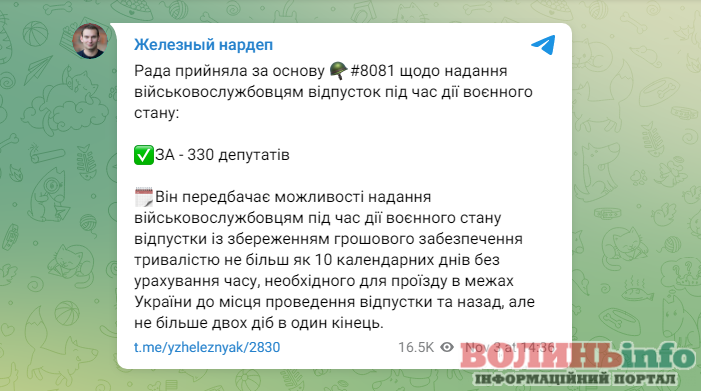 Про це повідомив народний депутат від парламентської фракції “Голос” Ярослав Железняк у своєму Телеграмі.