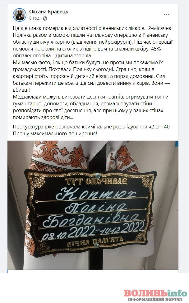 У Рівному в обласній лікарні померла двомісячна дівчинка. Дитина мала вроджену ваду та померла одразу після операції. Поліція Рівного розслідує неналежне виконання медиками професійних обов’язків.