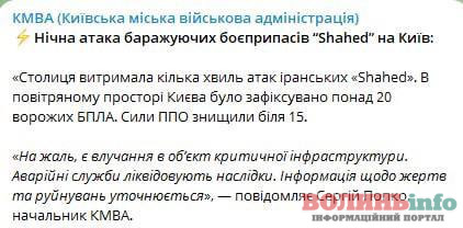За інформацією КМВА, в повітряному просторі Києва було зафіксовану понад 20 ворожих БПЛА, з яких 15 збила українська протиповітряна оборона.