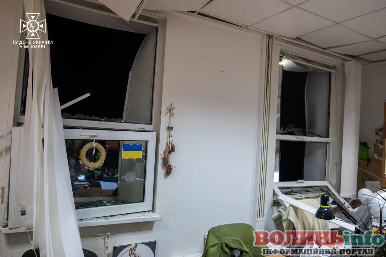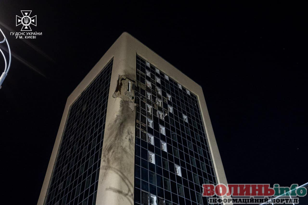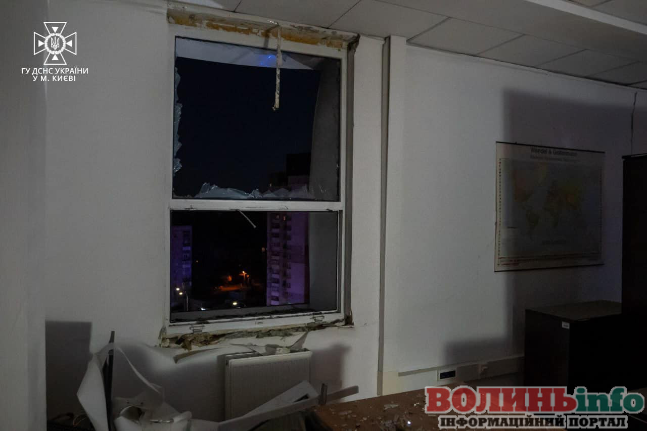 Наслідки атаки «шахедів» на у Солом’янському районі показали у ДСНС. Пошкодили фасад адмінбудівлі з 9-го по 11-й поверх. Постраждалих немає.