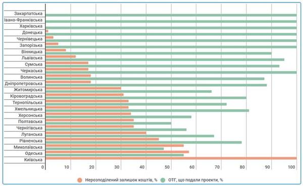 Більшу частину коштів розподілили об’єднані громади Донецької (залишок коштів 1 %), Чернівецької (залишок 3 %), Запорізької (залишок 5 %) та Вінницької (залишок 8 %) областей.