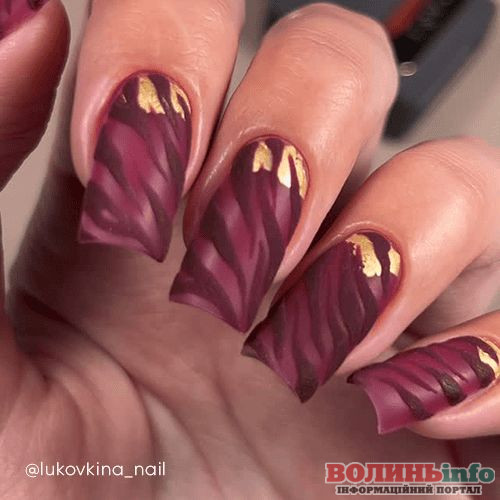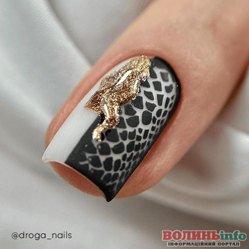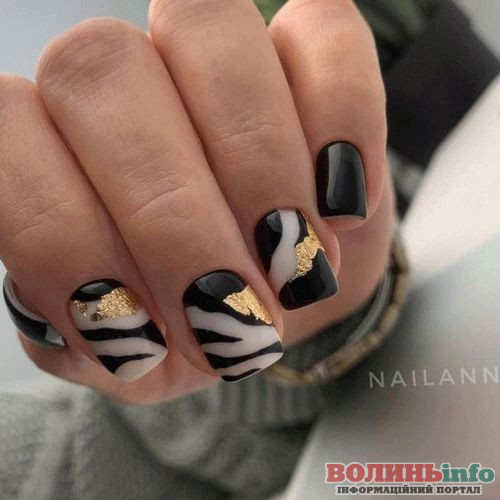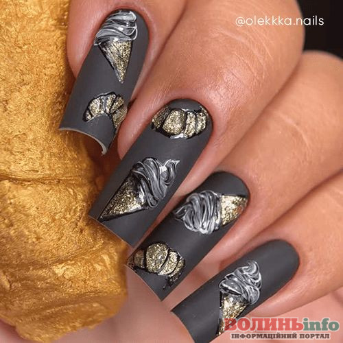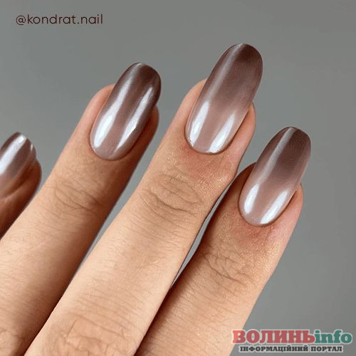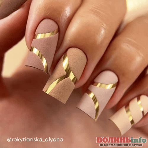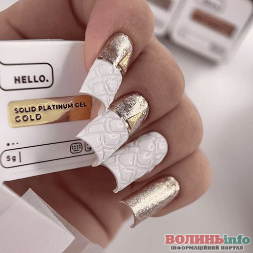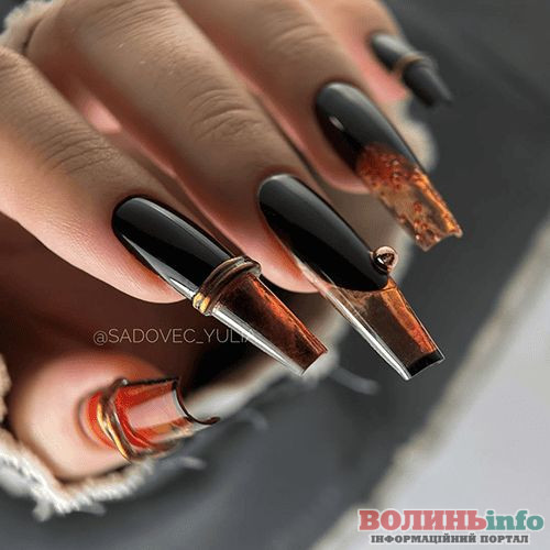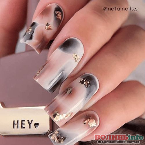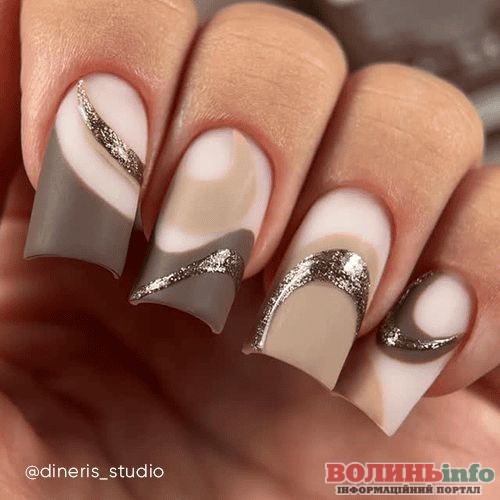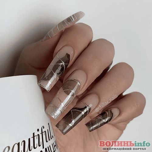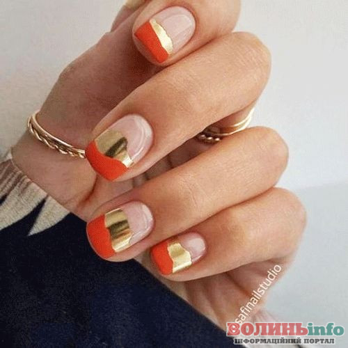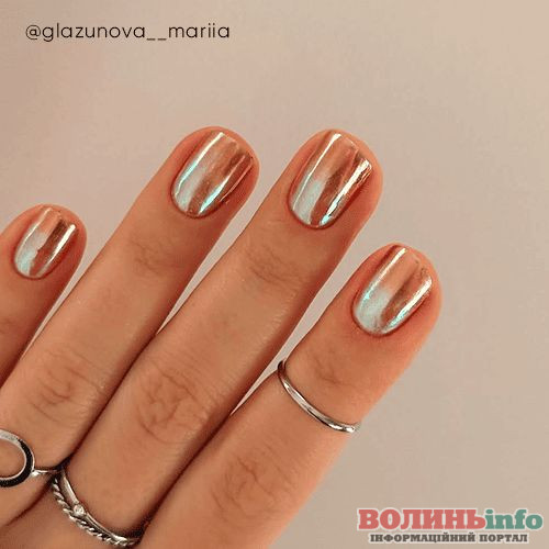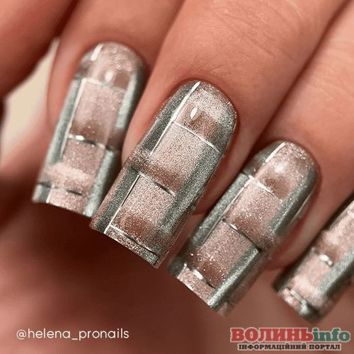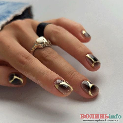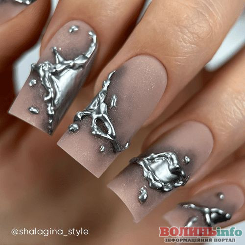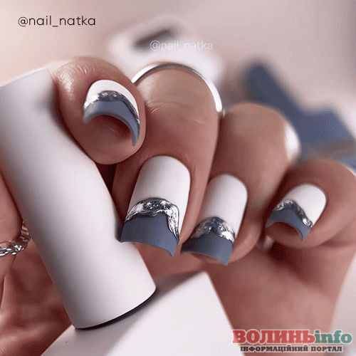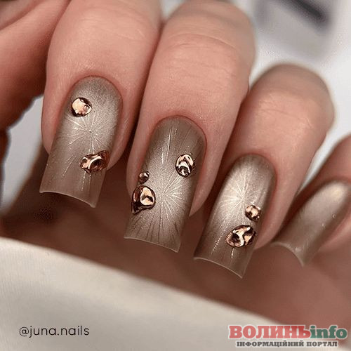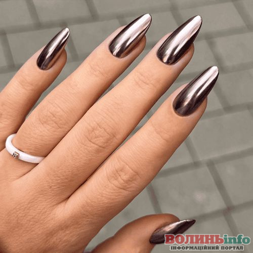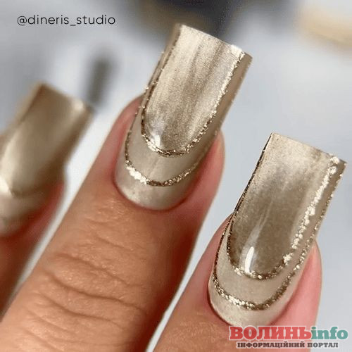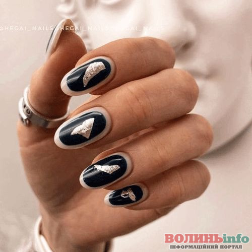 Золото й срібло доречні як на нюдовій базі для денного образу, так і на темних глибоких відтінках — для вечора. Легкі дотики фольги, «рвані» відбитки чи тонкі металеві лінії замінять складний дизайн.