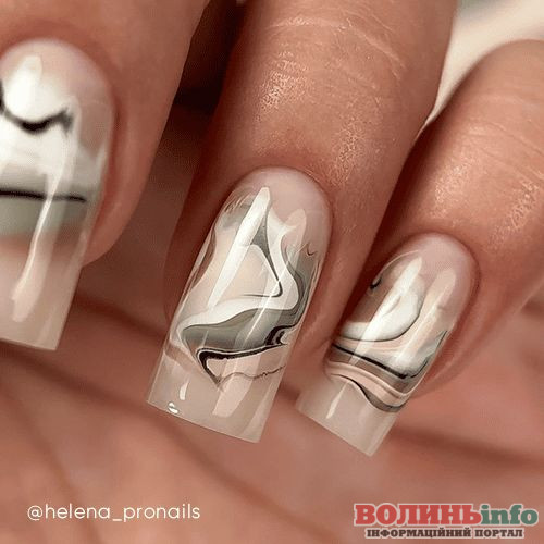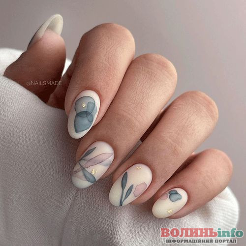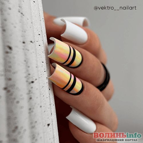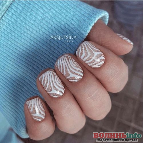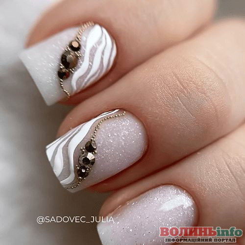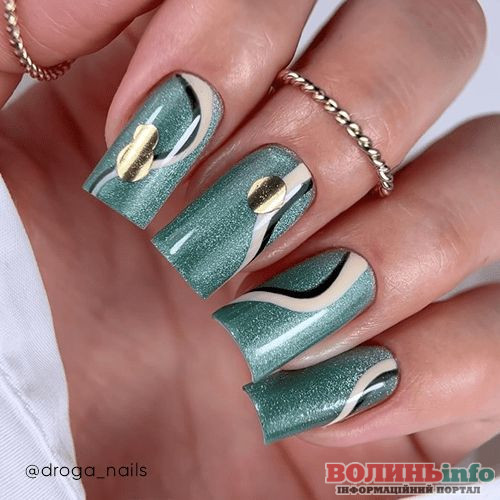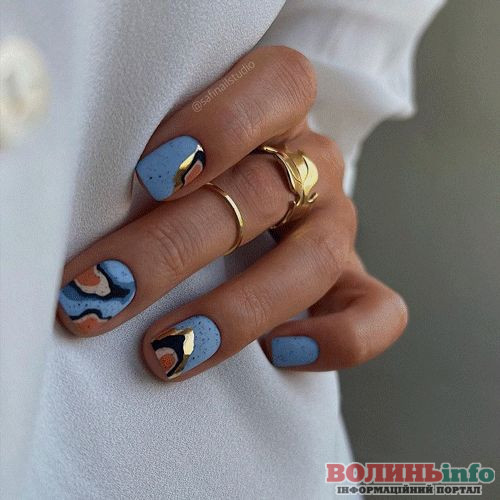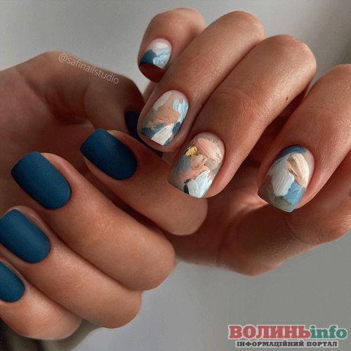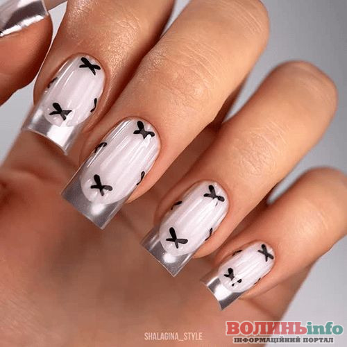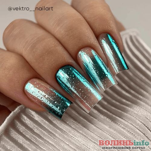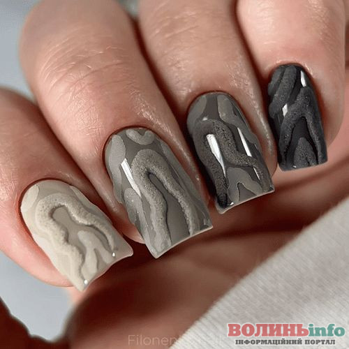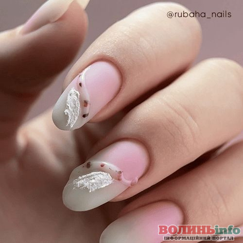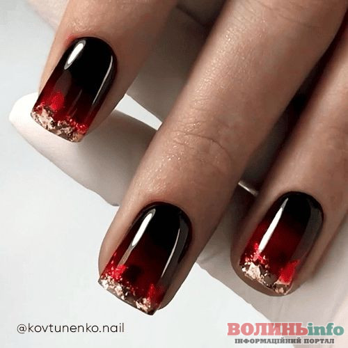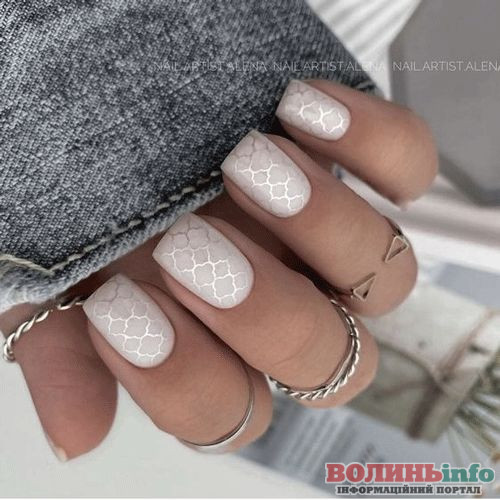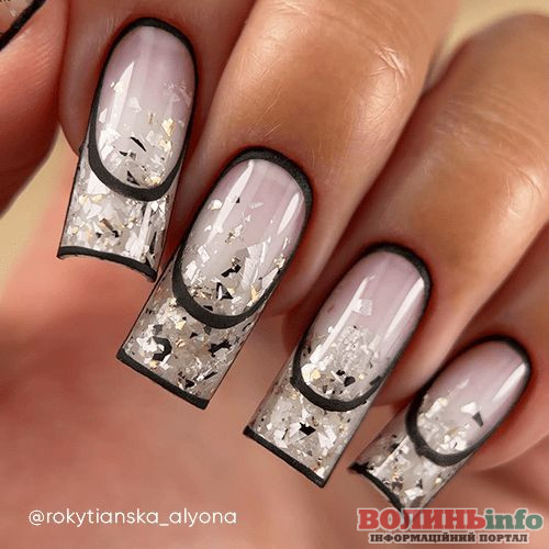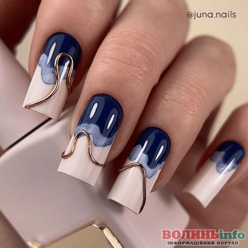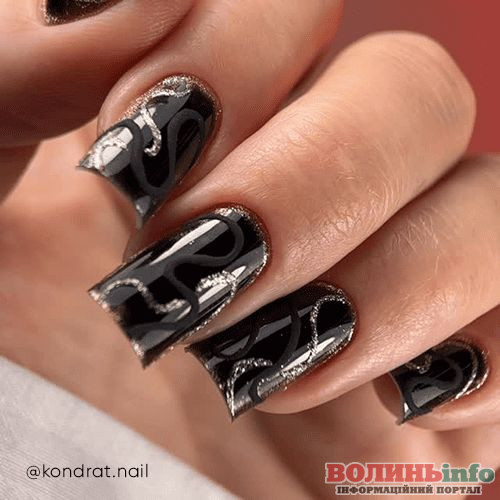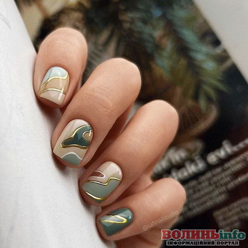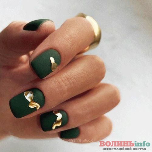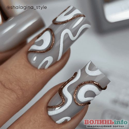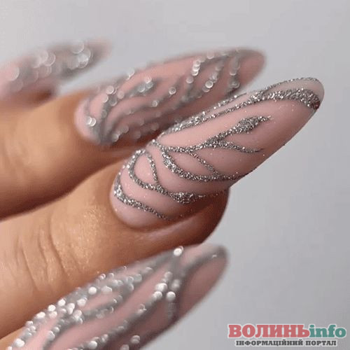 Золото й срібло доречні як на нюдовій базі для денного образу, так і на темних глибоких відтінках — для вечора. Легкі дотики фольги, «рвані» відбитки чи тонкі металеві лінії замінять складний дизайн.