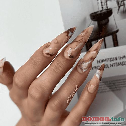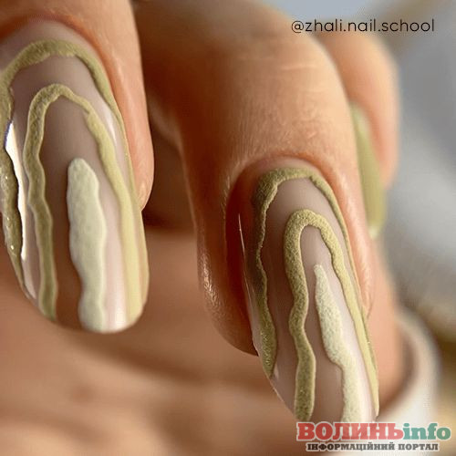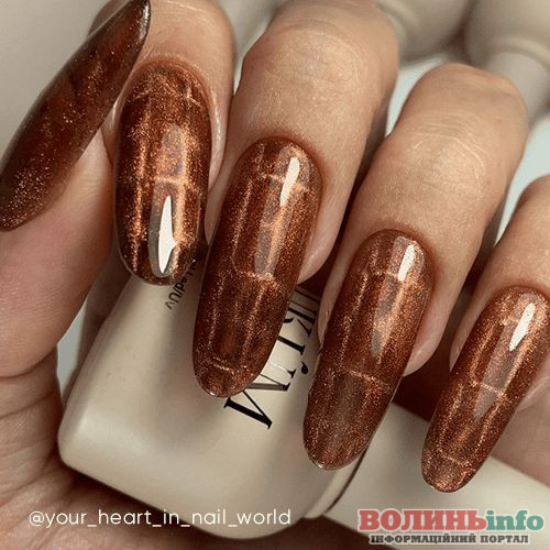 Тренд сезону — комбінувати близькі теплі тони в одному манікюрі: карамель, кориця, сепія, мідь. Додайте просту геометрію контрастною фарбою чи металізованим лайнером — і отримаєте графічний, але стриманий дизайн.