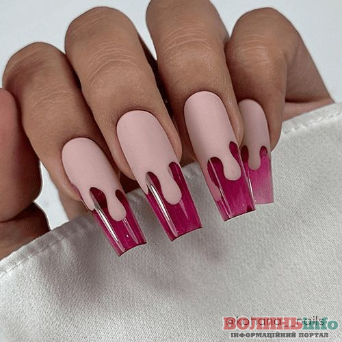 Витягнута форма зі зрізаним кінчиком потребує чистоти виконання. На ній елегантно виглядають френч із блиском, акцентні стрази, градієнт з мікроглітером або тонка металізована графіка.