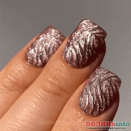 Осінь любить тактильність: «в’язаний» нейл-арт, пісочний/оксамитовий фініш, 3D-елементи з осінніми мотивами (листочки, краплі). Текстури не лише трендові, а й практичні — вони маскують дрібні нерівності й довше тримають форму.