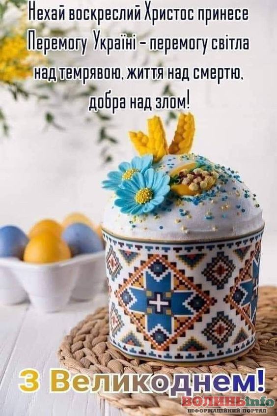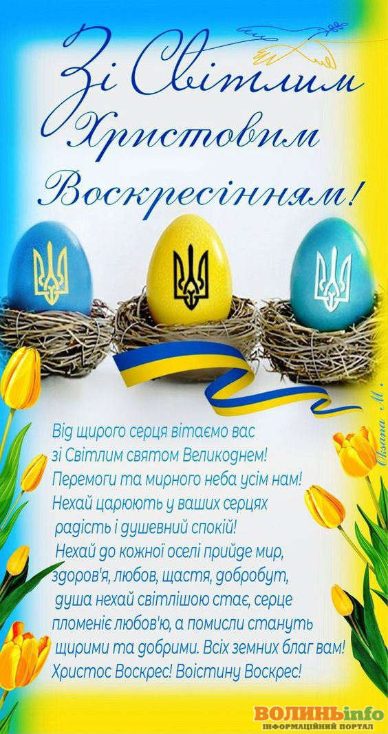 Слава Україні! Нехай це свято Великодня принесе у кожен дім радість, щастя та віру у майбутнє нашої незалежної України. Бажаємо, щоб кожен українець відчував гордість за свою країну, любов до рідної землі та повагу до національних традицій.
