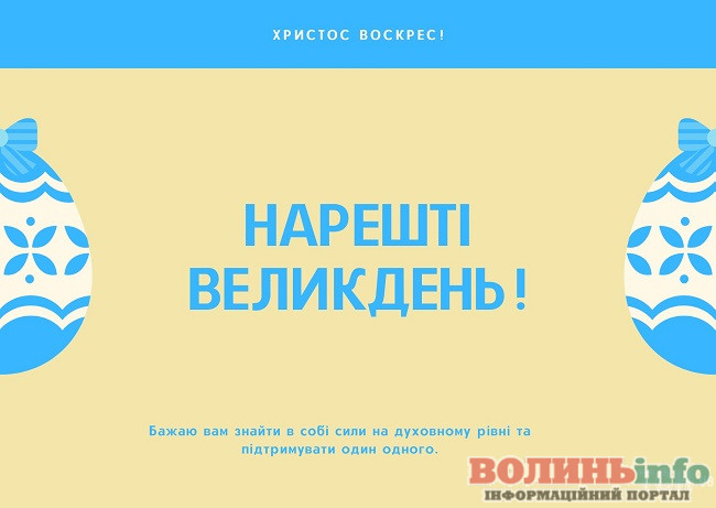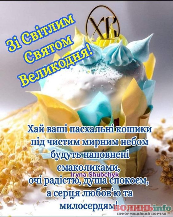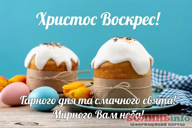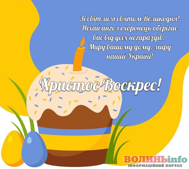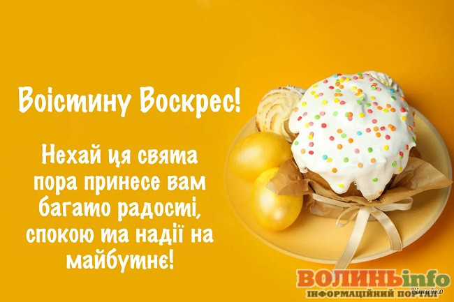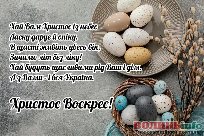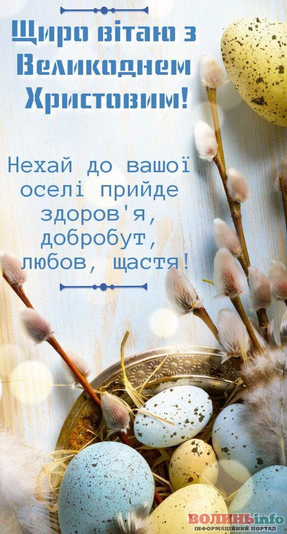 Зі святом Великодня! Бажаю, щоб усі турботи розчинилися у мирі і щасті, а в душі завжди було спокійно і тепло. Нехай Господь береже тебе і твою родину, даруючи мир у кожен дім.