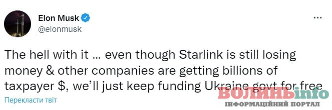 Біс із тим… хоча Starlink все ще втрачає гроші, а інші компанії отримують мільярди доларів від платників податків, ми просто продовжуватимемо безкоштовно фінансувати український уряд.