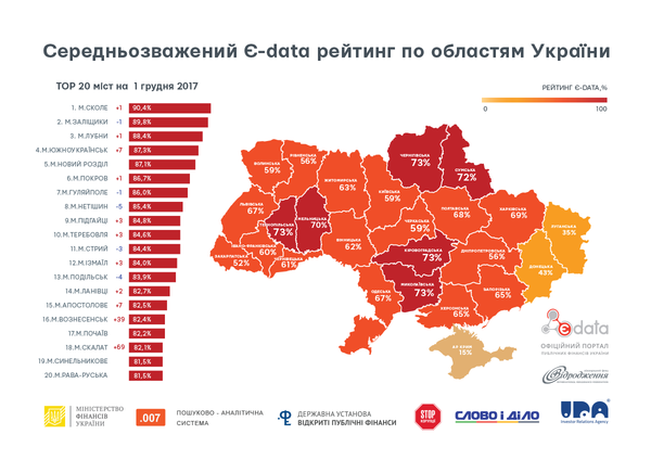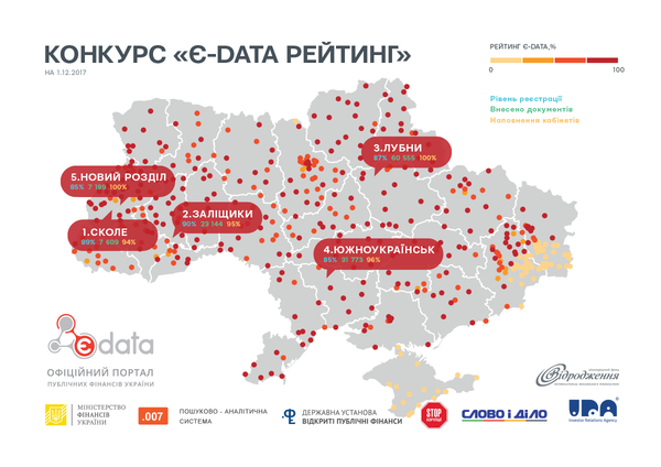Національний конкурс «Є-data Рейтинг», в якому бере участь 461 населений пункт України зі статусом міста, підводить підсумки 2017 року. Державні службовці почали більш активно звітувати щодо витрат бюджетних організацій. За два місяці з 1 жовтня до 1 грудня 2017 року кількість опублікованих на Єдиному веб-порталі використання публічних коштів www.e-data.gov.ua договорів, актів та звітів збільшилася майже на 2 млн. У третьому кварталі така ж кількість документів була опублікована за 3 місяці. В рейтингу, як і раніше, лідирують невеликі міста. Проте великі міста обласного підпорядкування теж активізувалися. Відзначається схід України.
