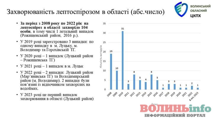 Пропонуємо звернути увагу на діаграму Волинського обласного центру контролю та профілактики хвороб. Там ви можете побачити захворюваність на лептоспіроз в області з 2008 по 2023 рр.