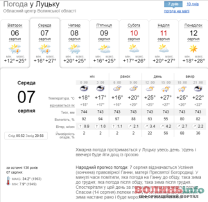 - На заході грози з дощем, +12°С…+16°С у темну пору доби та +26°С…+31°С вдень;