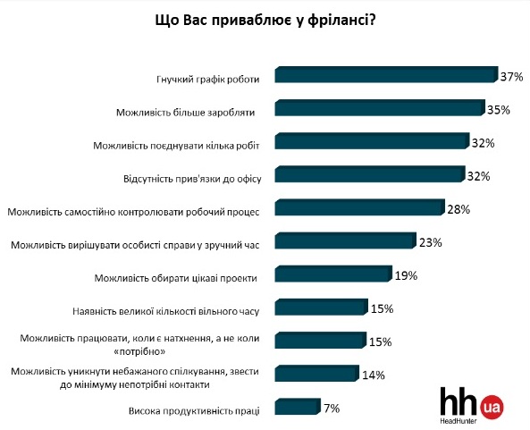 32% опитаних у роботі фрілансером подобається відсутність прив’язки до офісу й конкретного робочого місця. Респонденти наголошують, що завдяки цьому можна уникнути надмірного контролю керівництва та не відволікатися на сторонні подразники. Кожен четвертий українець вважає, що робота фрілансером імпонує тим, що працівник може самостійно організовувати свій робочий процес. Він має можливість вибудовувати індивідуальний робочий графік та вирішувати, якою буде послідовність виконання робочих задач.