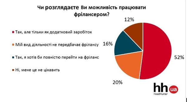 Можливість працювати фрілансером 52% опитаних розглядають лише у випадку необхідності заробляти додаткові кошти. Адже, згідно з результатами дослідження, проведеного Міжнародним кадровим порталом hh.ua, українці надають перевагу роботі в офісі, де мають можливість взаємодіяти з колегами, ділитись інформацією та досвідом. Що означає «ідеальне робоче місце» для українців. Кожен п’ятий респондент не готовий працювати віддалено та зауважує, що його основна робота не передбачає фрілансу.