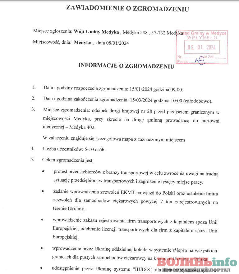 Водночас польські активісти поширюють інформацію, що вуйт ґміни Медика видав рішення про заборону зборів з 15 січня до 15 березня 2024 перед пунктом пропуску в Медиці.