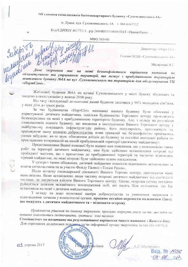 У торгово-розважальному центрі «ПортCity» відбулася зустріч з мешканцями ОСББ, які проживають на вулиці Сухомлинського. Під час зустрічі обговорили стан виконання звернення мешканців будинку №4а, які прохали перенести попільнички, що межують з дитячим майданчиком, а також відновити огорожу.