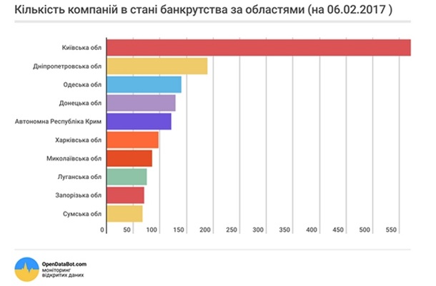 Лідером за кількістю компаній, які перебувають в стані банкрутства, є Київська область – 572 компанії. Далі йдуть Дніпропетровська і Одеська області зі 189 і 140 підприємствами-банкрутами відповідно.