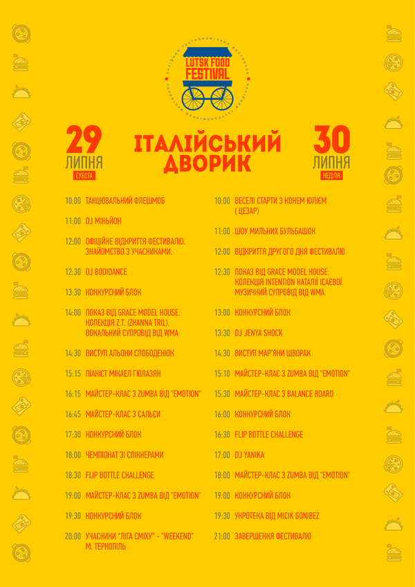 29 та 30 липня відбудеться найсмачнішаі найочікуваніша подія – шостий гастрономічний фестиваль «Lutsk Food Fest». Напередодні дійства організатори оприлюднили погодинну програму фестивалю.