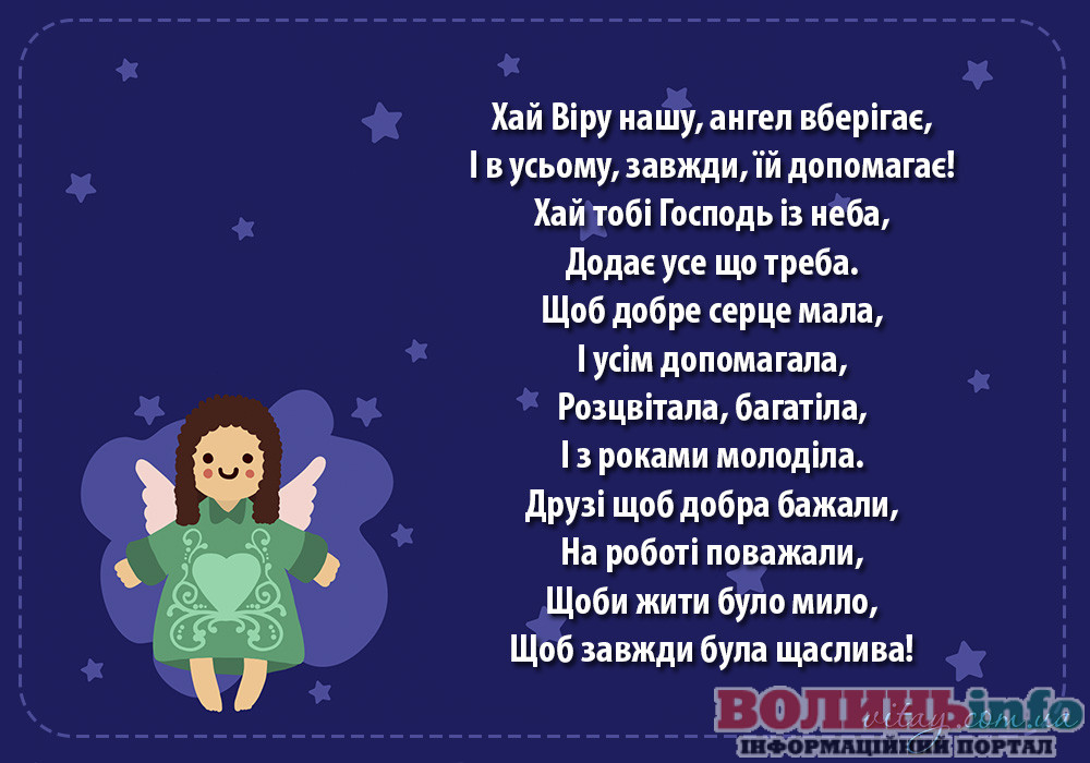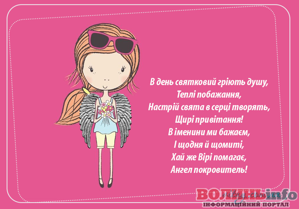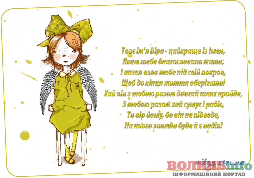 З Днем ангела тебе! Нехай добрий художник розфарбує твоє життя яскравими фарбами, а талановитий композитор напише мажорну мелодію твоєї долі. У сплячої красуні були феї, а твоєю феєю нехай буде твоя свята заступниця Віра. Бажаю тобі міцного здоров’я і сил, везіння, успіхів та удачі у всіх починаннях, здійснення заповітних бажань, вірних друзів і сімейного щастя!