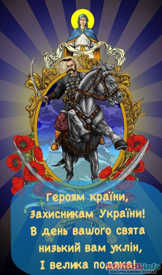 У День українського козацтва та Покрови Пресвятої Богородиці від щирого серця хочу побажати вам міцних сил і незламної віри, бравих ідей і добрих надій, впевнених планів і обов’язкової удачі, незгасного оптимізму і відмінного виконання всіх поставлених завдань. Хай береже вас від усіляких бід Свята Богородиця.